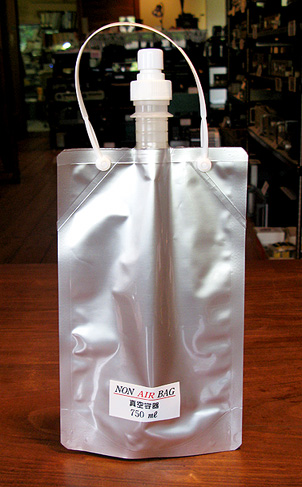 元々はワインや日本酒などが空気で酸化しない様に作られたものらしいが、背骨のある柔らかい容器に液体を入れると負圧が掛かる現象を応用した特許製品である。